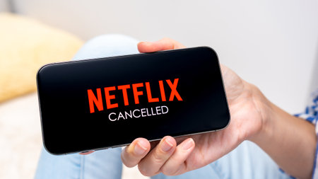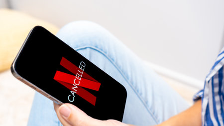 Ottawa ON, Canada - October 06, 2025: Individual using smartphone shows Netflix logo with 'CANCELLED' text, reflecting emotions in cozy home environment