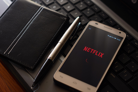Kuala Lumpur,Malaysia - January 28th,2018 : Smartphone on a white wooden table with Netflix. Netflix specializes in and provides streaming media and video-on-demand online and DVD by mail.