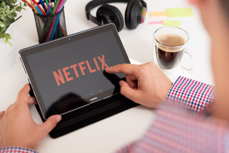 Wroclaw, Poland - SEP 16, 2020: Man with Netflix logo on screen. Netflix is most popular video streaming platform.