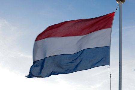 Netherlands flag. Dutch national symbol waving on pole against blue sky with clouds, sunny day