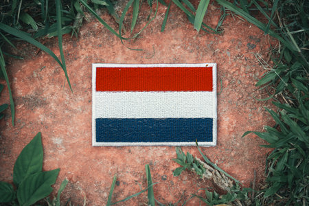 Top view of Netherlands embroidered flag on natural stone with leaves.
