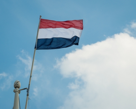 Waving flag of The Netherlands on the flagpole against blue sky with some clouds
