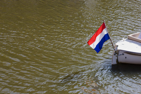 Dutch red, white and blue striped flag in breeze on stern of boat in Rotterdam, Holland.