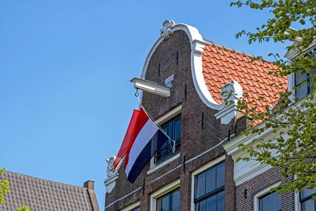 Amsterdam, The Netherlands, October 09, 2018: Ffluttering holland flag and roof of maritime museum on background
