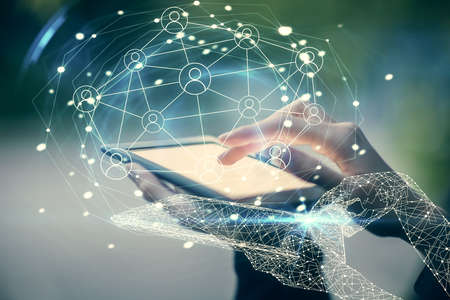 Double exposure of social network sketch hologram and woman holding and using a mobile device.
