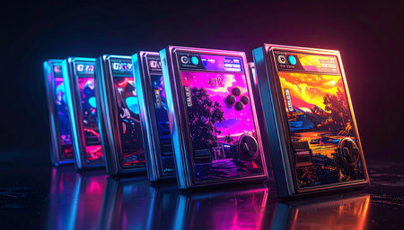 A prized collection of digital trading cards glows with neon energy in a futuristic display.