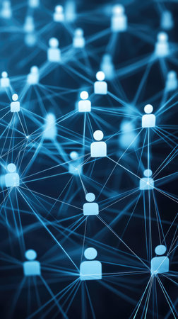 This image features yellow nodes connected by lines, illustrating a social network concept that emphasizes digital connections and online community interactions.