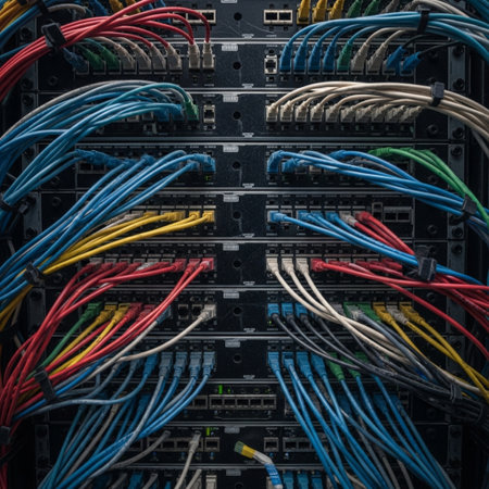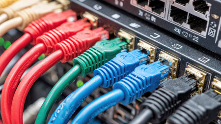 This close-up image showcases a network switch with vibrant Ethernet cables, highlighting the intricate connections essential for data transmission in modern networks.