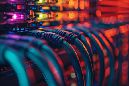 Closeup of network cables plugged into data center equipment glowing with vibrant lights technology concept