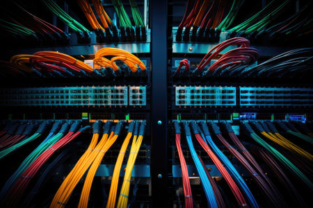 A high efficiency fiber optic network cables glowing server rack with colorful led light ambience, dynamic connectivity feeling