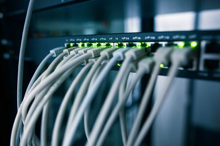 Network Ethernet Cables. Network switch with optical and ethernet connected wires. High quality photo