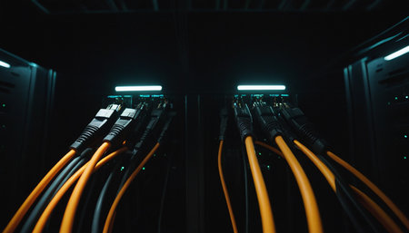 Bright lights of a network server rack illuminate the darkened space, showcasing connected cables and equipment in a bustling data center environment during nighttime operations