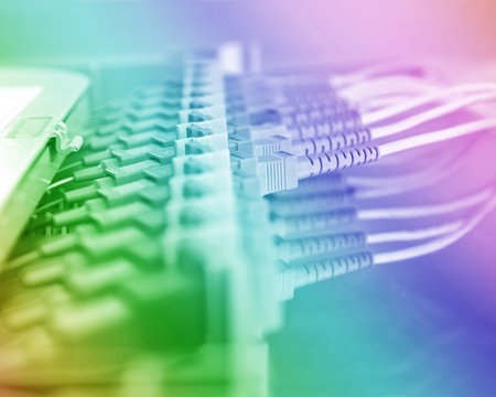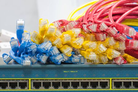 Colorful network cables close up connected to server equipment tech concept