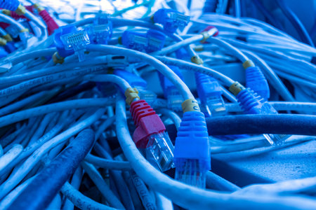 A close-up view of a network hub, with cables connecting and transmitting data, showcasing the intricate network infrastructure within a modern data center.