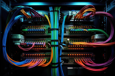 A detailed close-up view of colorful electrical wires and cables, emphasizing the intricate connections and vibrant colors in a technology setting.