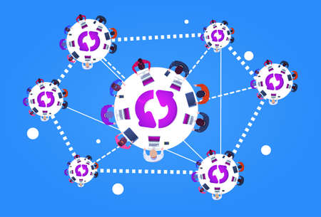 Business People Connection Team Sit At Round Desks Working On Laptop Computers Top Angle View With Update Sign Flat Vector Illustration