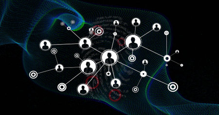 Connecting white nodes with silhouette avatars on teal mesh wave in cyberspace, with red rings. Social network, digital communication, connection, data flow, technology, abstract, innovation