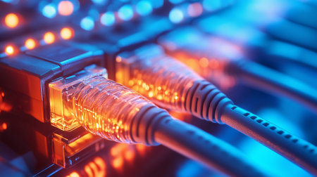 Macro shot of glowing network server hardware with Ethernet cables and LED indicators, symbolizing data transfer and connectivity.