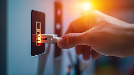 This image features a close-up view of a power plug firmly inserted into a modern electrical outlet on a clean white wall, showcasing technology and design.
