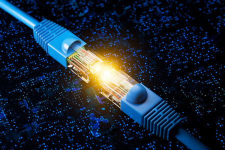 This close-up image features a glowing Ethernet cable connector, illustrating the technology behind digital communication. Perfect for tech-oriented themes.