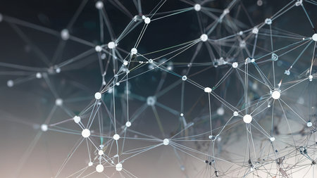 This abstract image showcases a digital network with glowing nodes connected by fine lines, creating a futuristic visual representation of technology and communication.