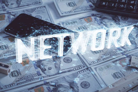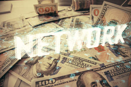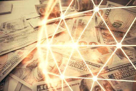 Multi exposure of social network drawing over us dollars bill background. Concept of people connection.