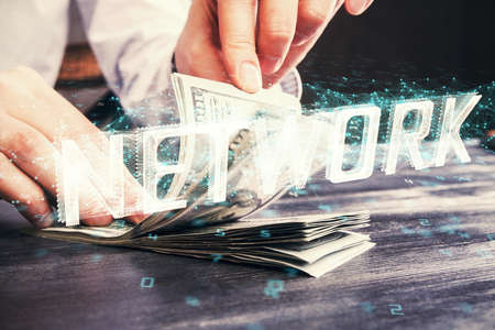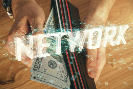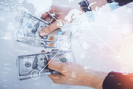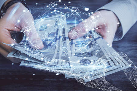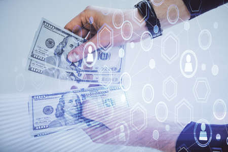 Multi exposure of social network theme drawing hologram and USA dollars bills and man hands.