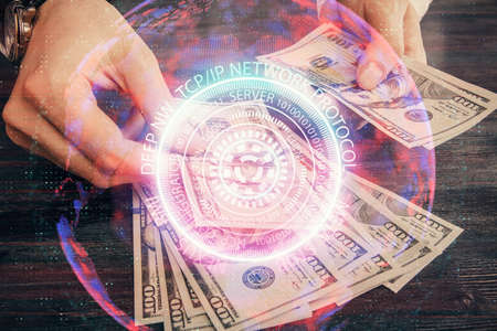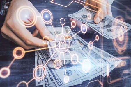 Multi exposure of technology drawing hologram and us dollars bills and man hands. Data concept