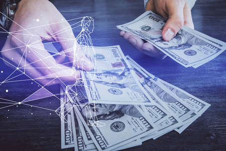 Multi exposure of handshake drawing hologram and USA dollars bills and man hands.
