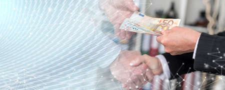 A young hand giving a bill of money to another old hand and in the middle a glass that prevents it.