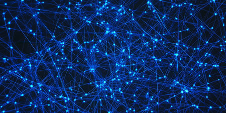 An abstract blue background filled with glowing interconnected nodes and luminous lines, suggesting a complex...