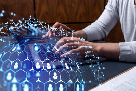 Hands of hr specialist is typing the keyboard in the internet to find the best candidates to create international network in recruitment process. Concept of success. Social media hologram icons.