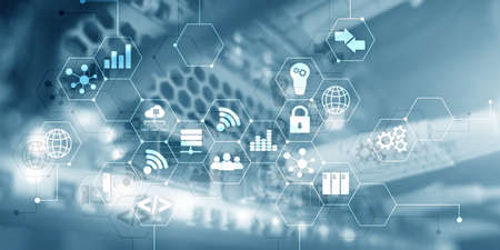 Information and telecommunication technology concept. Diagrams with icons on server room backgrounds
