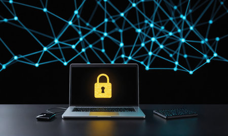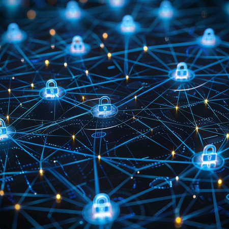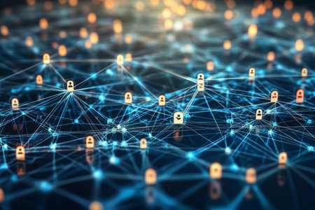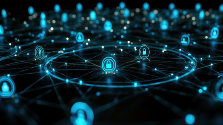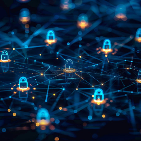 This image illustrates the concept of digital security through interconnected locks symbolizing data protection in an advanced technology network, emphasizing the importance of cybersecurity.