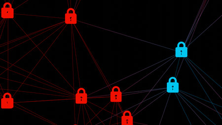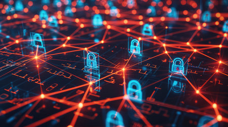 This abstract digital background features glowing lock icons interconnected by bright lines. The composition in blue and red hues represents network security and data encryption, creating a modern and engaging visual suitable for technology themes.