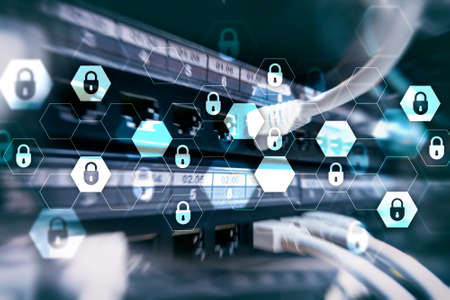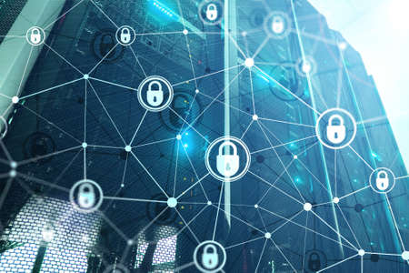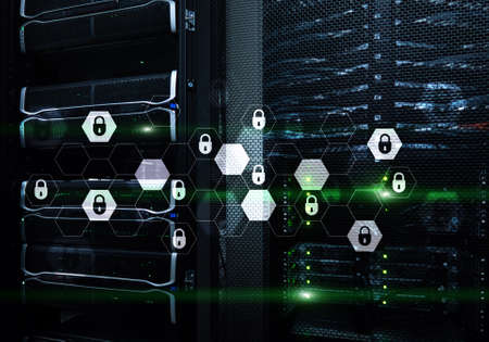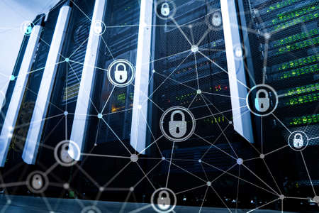 Server rack room digital security data protection concept.