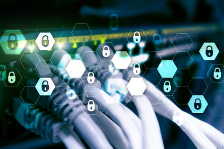 Cyber security, information privacy, data protection concept on modern server room background. Internet and digital technology concept.