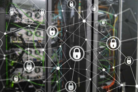 Security of technology protection with blurred network server storage in datacenter background for business and technology security concept