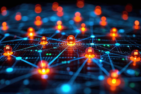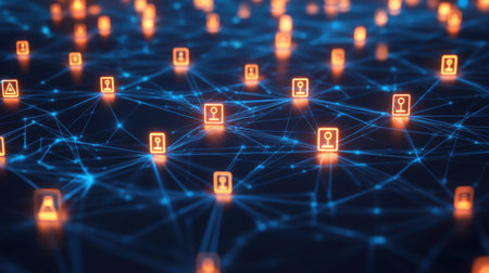 A captivating abstract visualization featuring illuminated icons on a digital network, illustrating connections and data flow in a modern technology landscape.