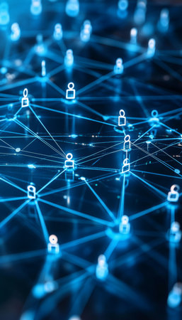 A digital of a blue network with interconnected nodes and glowing connections forming a futuristic abstract pattern