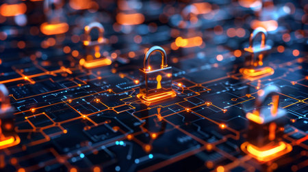 This image portrays a collection of digital padlocks positioned on a circuit board, symbolizing data security and encryption in a modern cyber world.