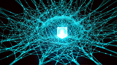 A network infrastructure with glowing connection lines and a central shield icon, visualizing advanced cyber security technologies in communication.