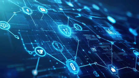 Abstract digital network showcasing interconnected technology symbols, emphasizing themes of social media, cybersecurity, and financial services in a blue color scheme.