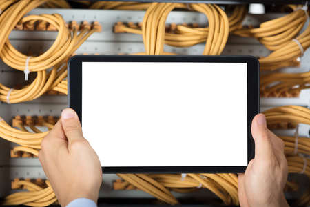 Male Technician's Hand Holding Blank Digital Tablet In Front Of Server