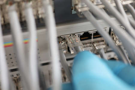 An Expert Engeneer in datacenter server room connecting cables in server cabinet in network server room.