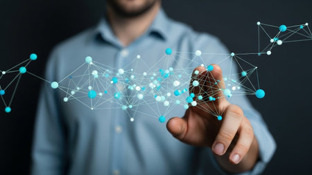 Glowing nodes connected by lines create a digital network design against a dark background.