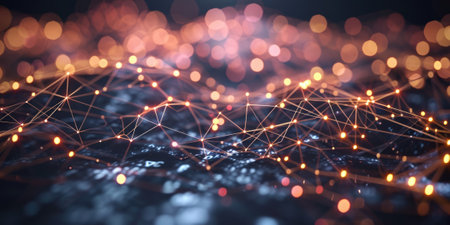 An abstract image showcases a network of interconnected nodes. The nodes have a warm, golden color, linked by lines that suggest connectivity. The composition is set against a dark background, and the lighting creates a sense of depth and dimension, suitable for technology or business applications.