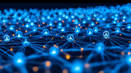 Illuminated network of connected user icons, representing digital communication and social interaction in a modern, tech-focused environment.