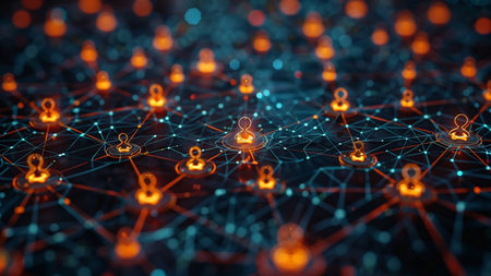 Intricate digital network view featuring glowing security icons and nodes. Perfect for technology and cybersecurity themes, illustrating connectivity and data.