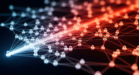 This abstract illustration features a dynamic network of lines and red nodes, symbolizing technology and communication in a modern digital landscape.
